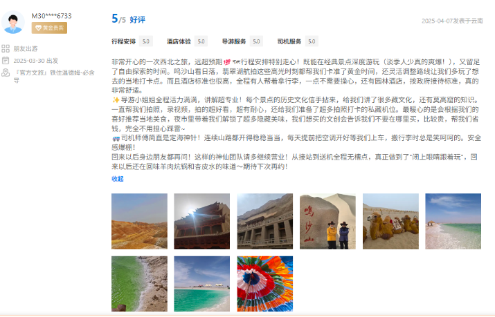 文旅国旅深度整合甘青两地的经典与小众旅游资源,精心打造、上线行程丰富、体验舒适产品的同时南京运营中心紧密围绕游客核心需求,协同配备金牌工作人员随团提供专业讲解与服务,获得广泛好评。平台数据显示,近半年以来,其携程店铺订单量同比增长超过40%,订单完成率高达98.5%,展现出高度的市场认可与出色的运营效能。用户口碑方面,店铺好评率持续稳步提升,目前已达4.9分,累计精选好评超千条,“质量可信、服务可依”的品牌形象日益凸显。